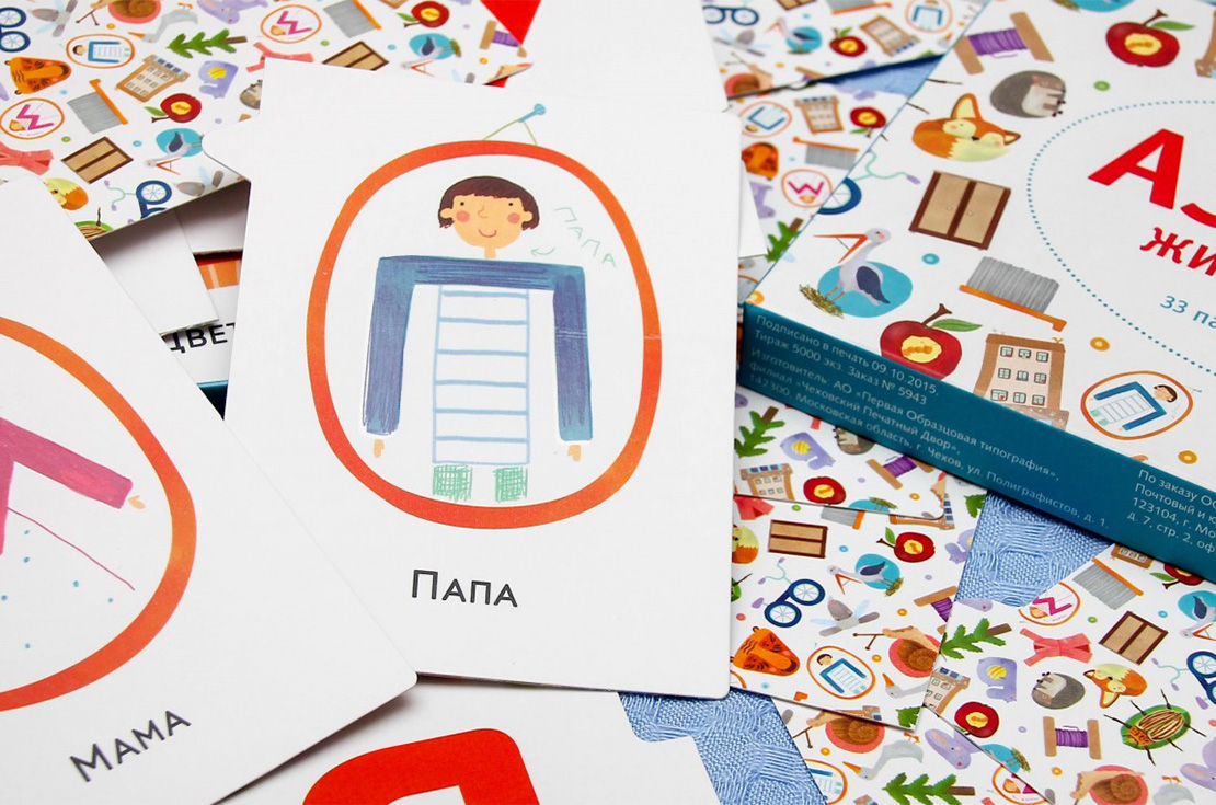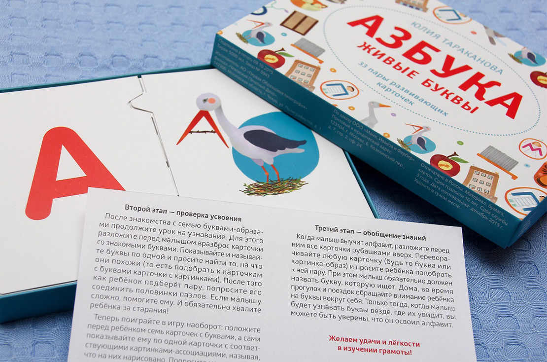 В яркой коробке набор карточек-пазлов для обучения малышей алфавиту. Она небольшая, поэтому её удобно брать с собой. Но самое главное — с её помощью ребёнок выучит все буквы за очень короткое время.